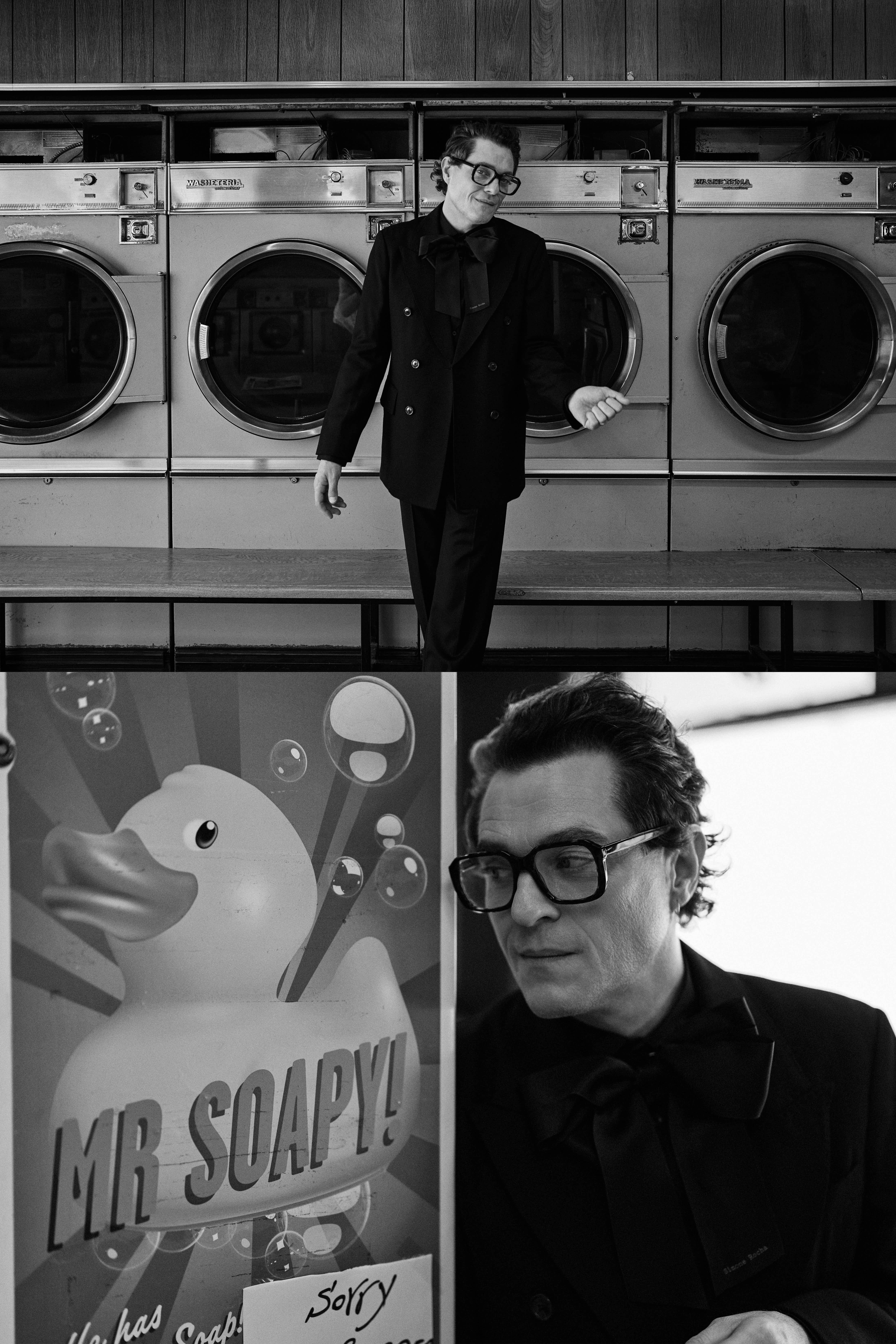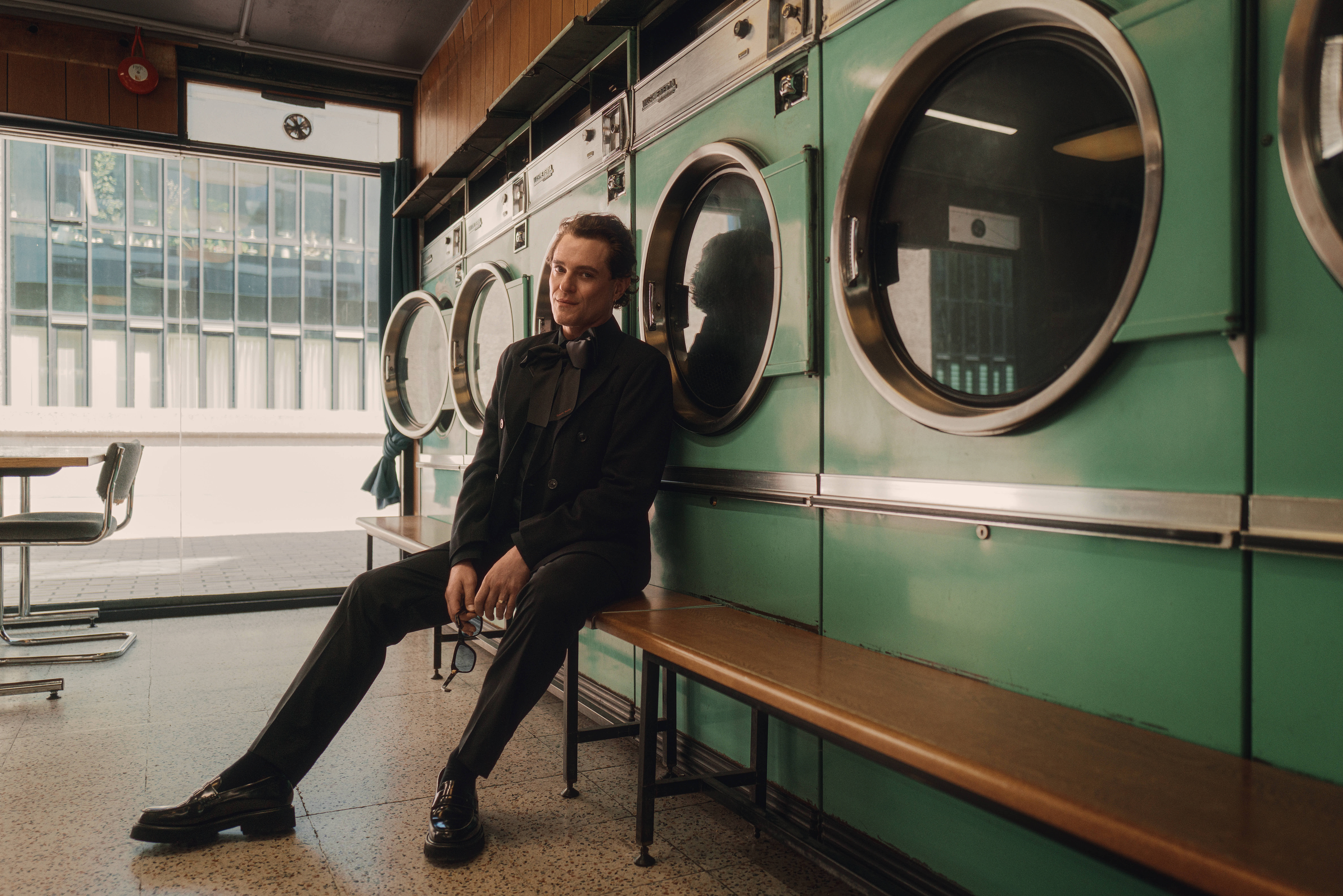 A series of images from a shoot with Matthew Horne, photographed in a Barbican laundrette ahead of his red carpet appearance at the BAFTAs.